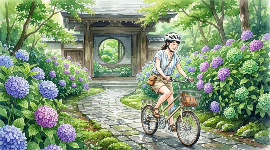 早朝に明月院を訪れて「明月院ブルー」を堪能し、その後は自転車で建長寺や円覚寺を巡り、午後は海沿いの道を走って長谷寺や大仏、稲村ヶ崎の景色を楽しむ。そんな欲張りで充実した1日が、鎌倉のポタリングなら実現できます。雨の日にはレインウェアを着込んで、雨に濡れた紫陽花の美しさを味わいながらゆっくり走る選択肢もあり、それもまた鎌倉の雨の季節ならではの忘れられない旅の記憶になるでしょう。